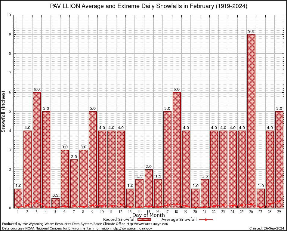 PAVILLION (487115) February Average and Extreme Daily Snowfall AMounts (1919-2024) To index page for PAVILLION
