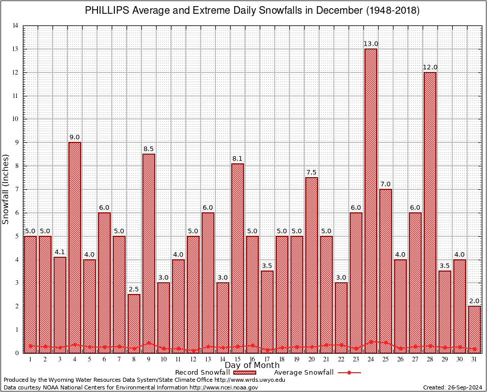 PHILLIPS (487200) December Average and Extreme Daily Snowfall AMounts (1948-2018) To index page for PHILLIPS