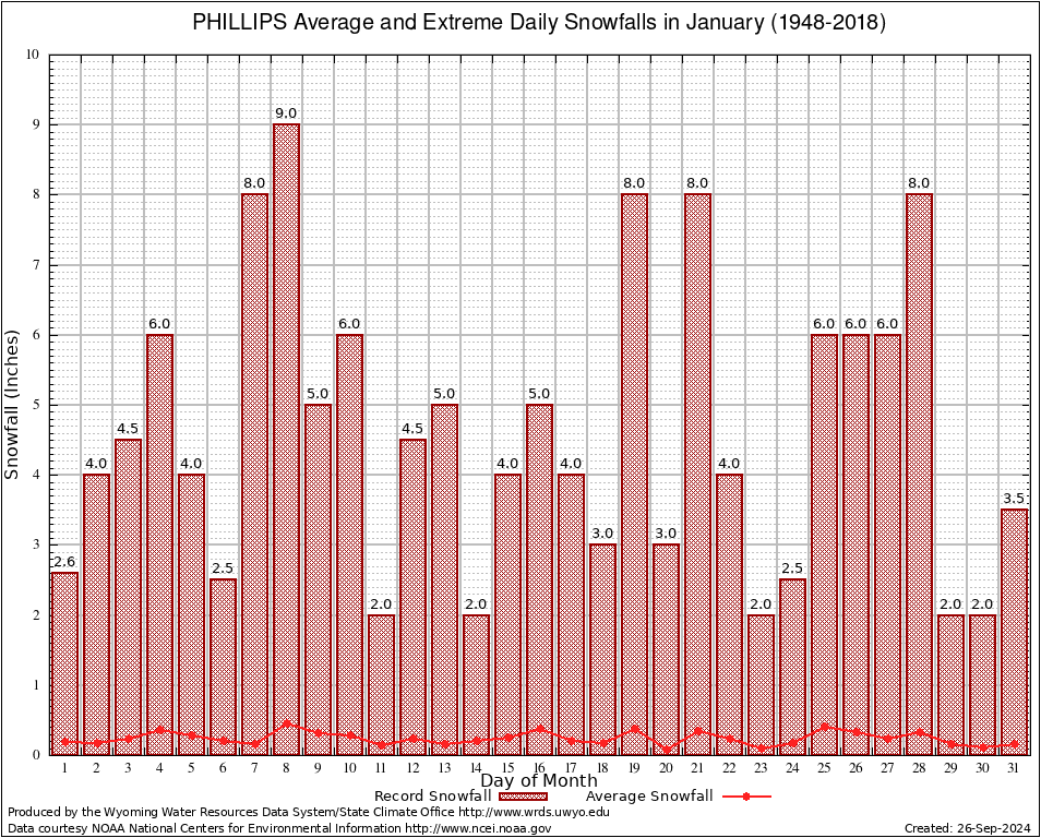 PHILLIPS (487200) January Average and Extreme Daily Snowfall AMounts (1948-2018) To index page for PHILLIPS