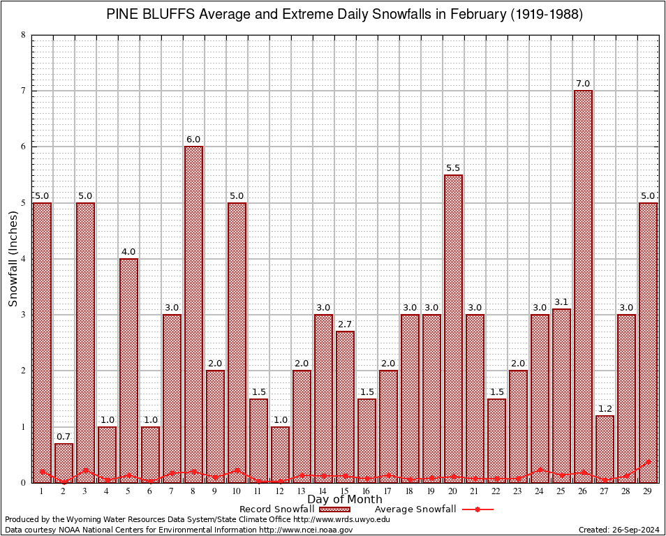 February Average and Extreme Daily Snowfall AMounts (1919-1988)