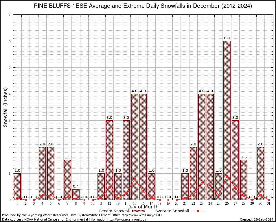 December Average and Extreme Daily Snowfall AMounts (2012-2024)