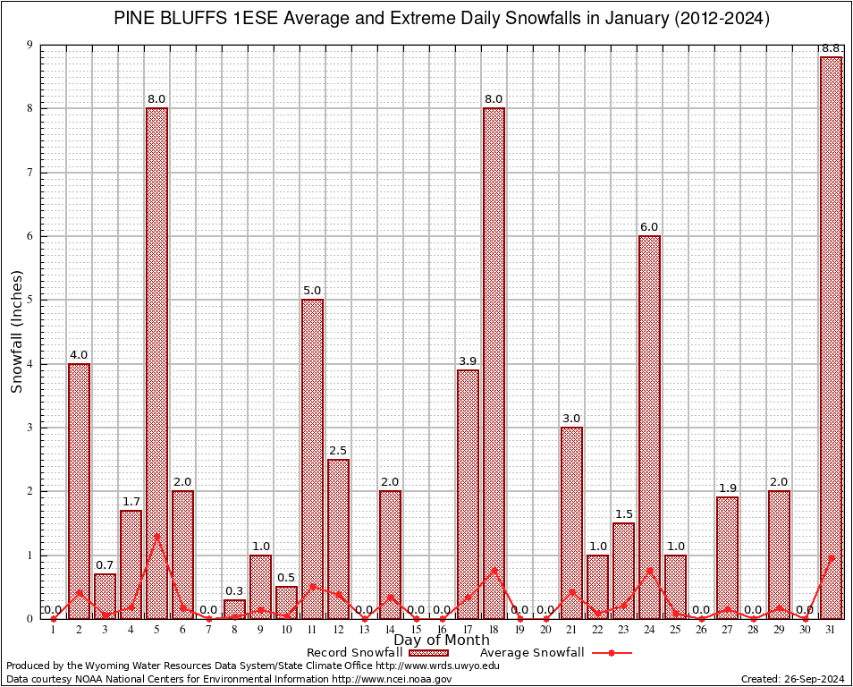 January Average and Extreme Daily Snowfall AMounts (2012-2024)