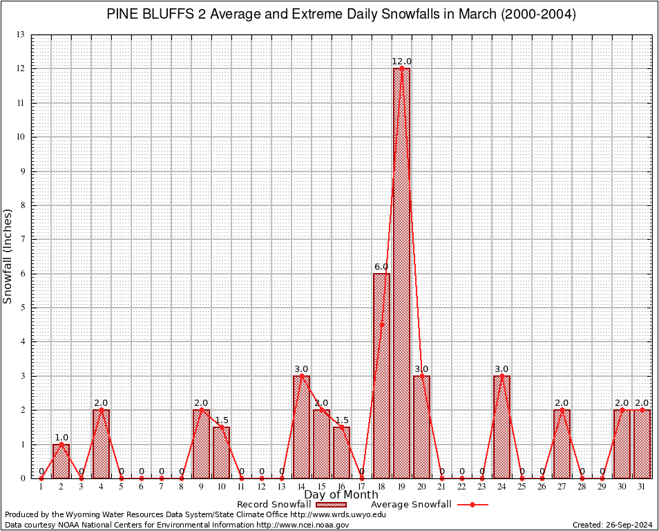 March Average and Extreme Daily Snowfall AMounts (2000-2004)