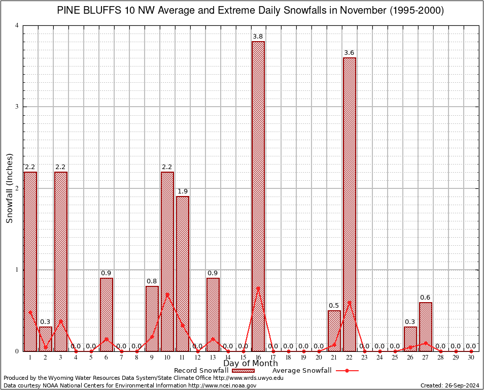November Average and Extreme Daily Snowfall AMounts (1995-2000)