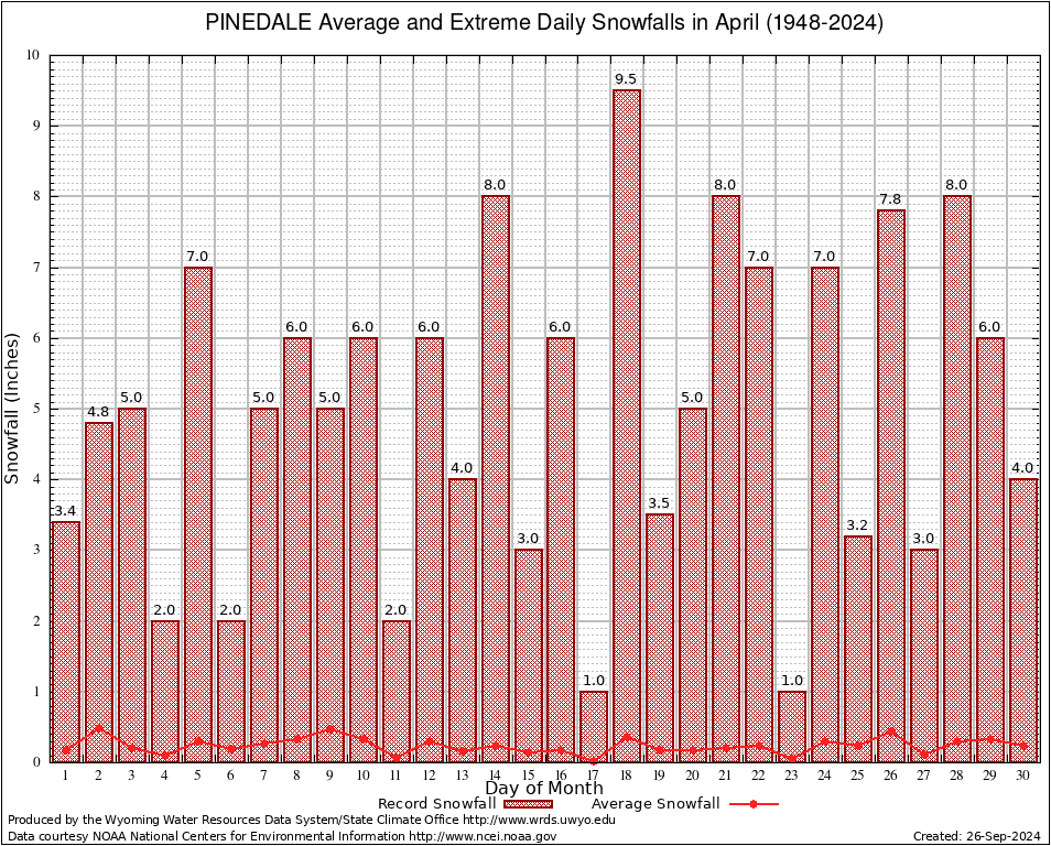 PINEDALE (487260) April Average and Extreme Daily Snowfall AMounts (1948-2024) To index page for PINEDALE