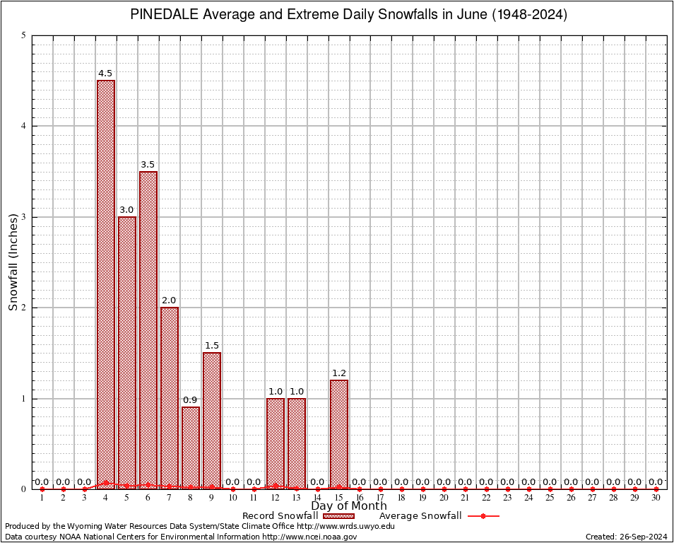 PINEDALE (487260) June Average and Extreme Daily Snowfall AMounts (1948-2024) To index page for PINEDALE