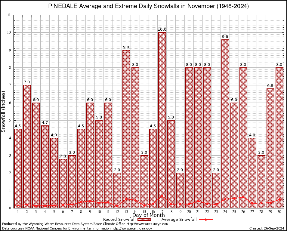 PINEDALE (487260) November Average and Extreme Daily Snowfall AMounts (1948-2024) To index page for PINEDALE