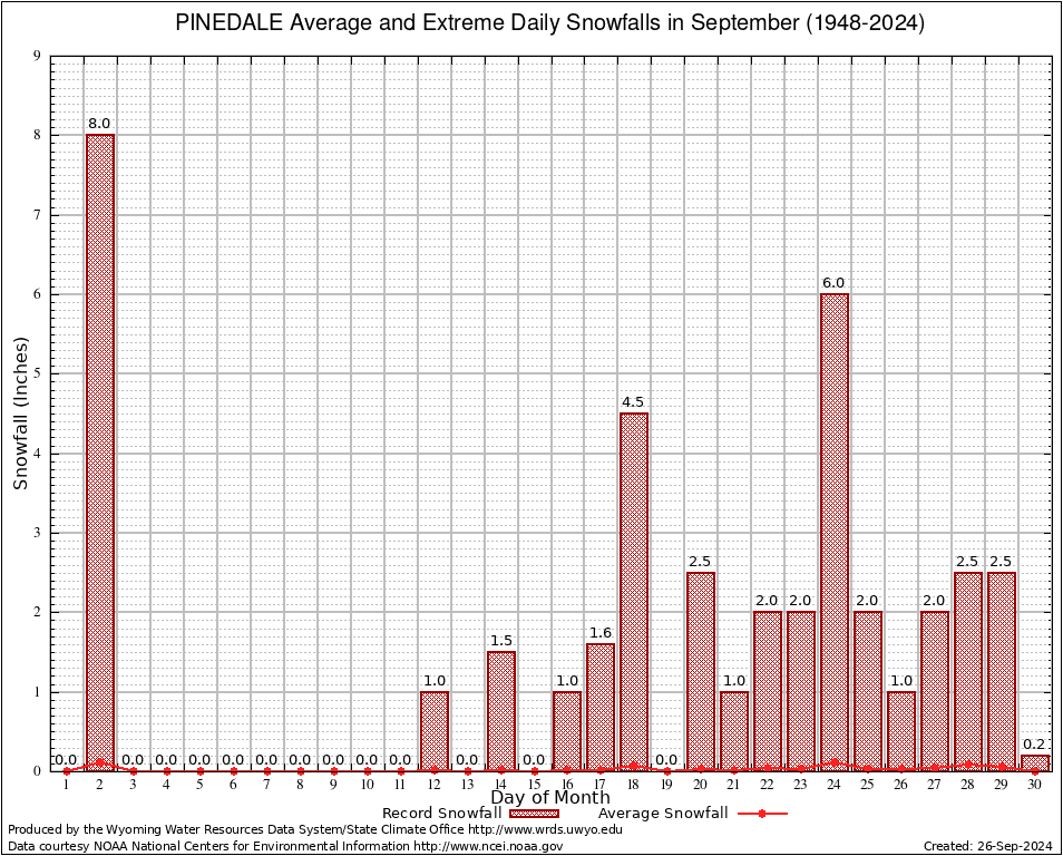 PINEDALE (487260) September Average and Extreme Daily Snowfall AMounts (1948-2024) To index page for PINEDALE