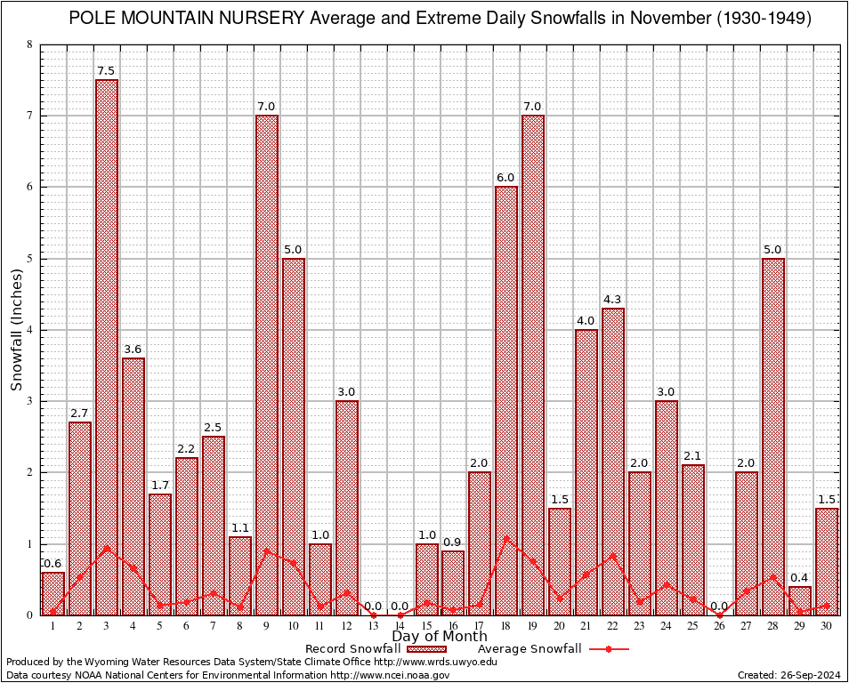 November Average and Extreme Daily Snowfall AMounts (1930-1949)