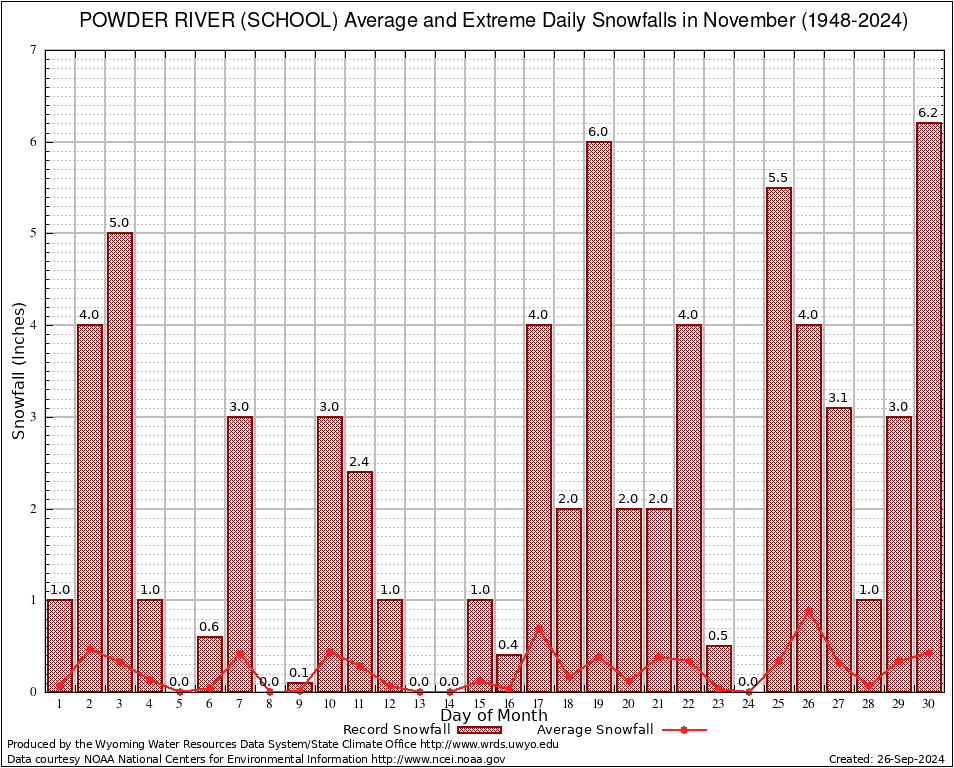November Average and Extreme Daily Snowfall AMounts (1948-2024)