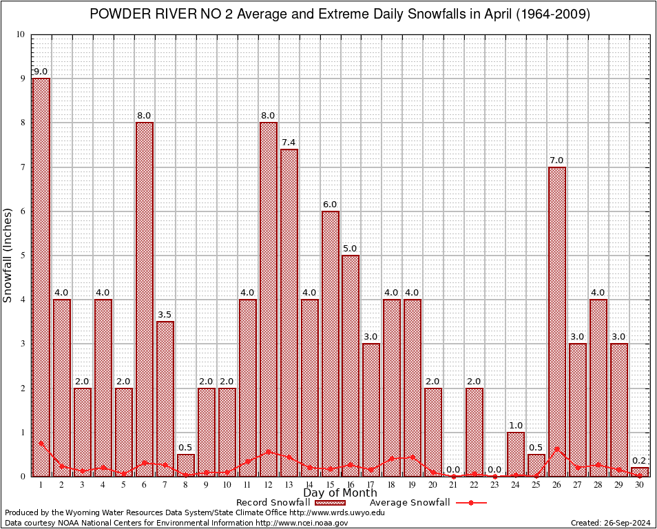April Average and Extreme Daily Snowfall AMounts (1964-2009)