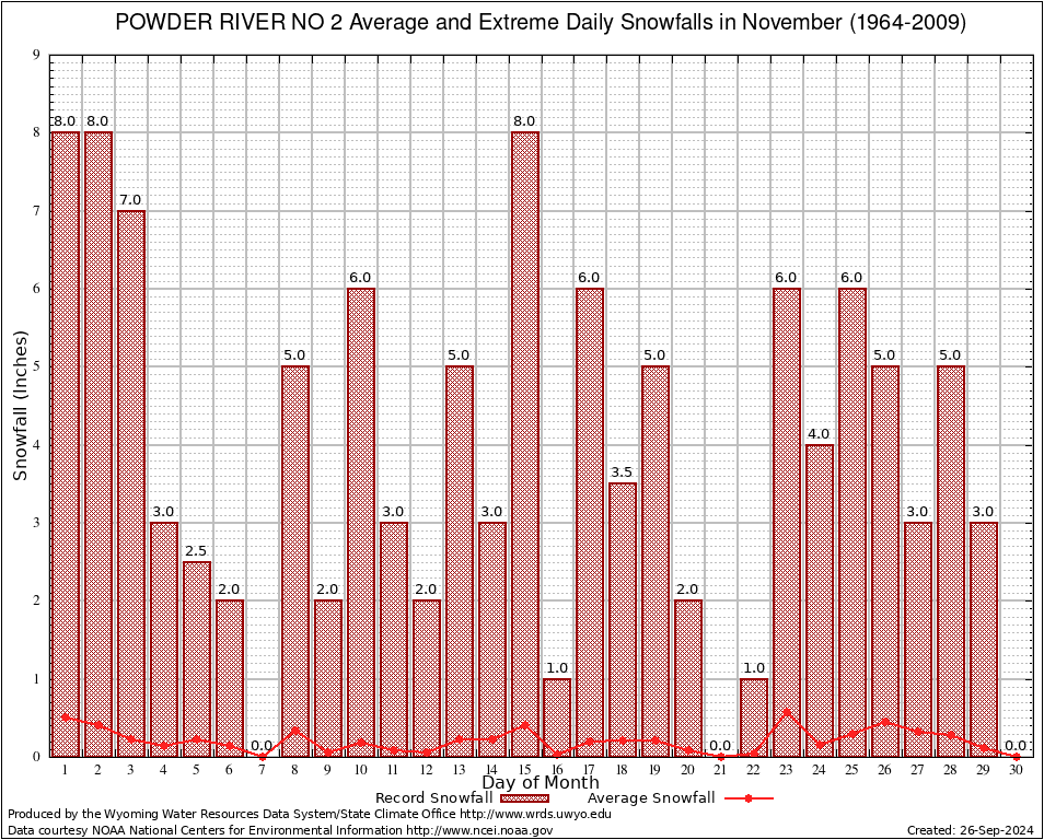 November Average and Extreme Daily Snowfall AMounts (1964-2009)