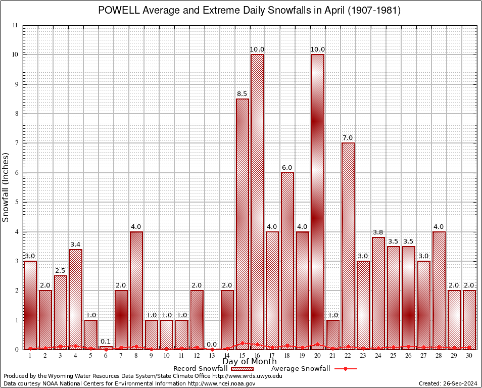 POWELL (487380) April Average and Extreme Daily Snowfall AMounts (1907-1981) To index page for POWELL
