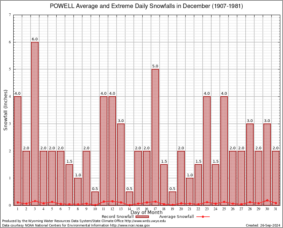 POWELL (487380) December Average and Extreme Daily Snowfall AMounts (1907-1981) To index page for POWELL