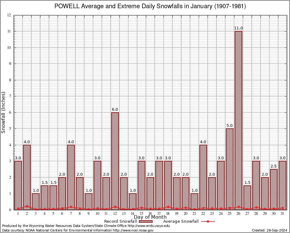 POWELL (487380) January Average and Extreme Daily Snowfall AMounts (1907-1981) To index page for POWELL
