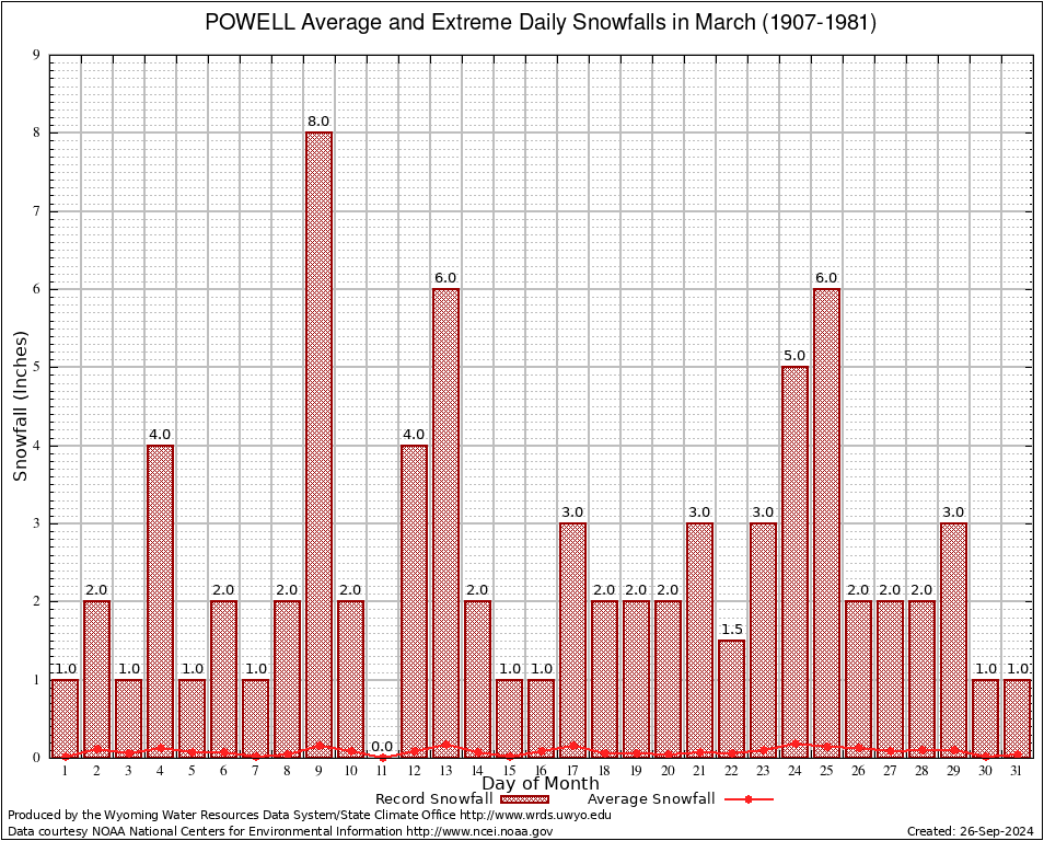 POWELL (487380) March Average and Extreme Daily Snowfall AMounts (1907-1981) To index page for POWELL