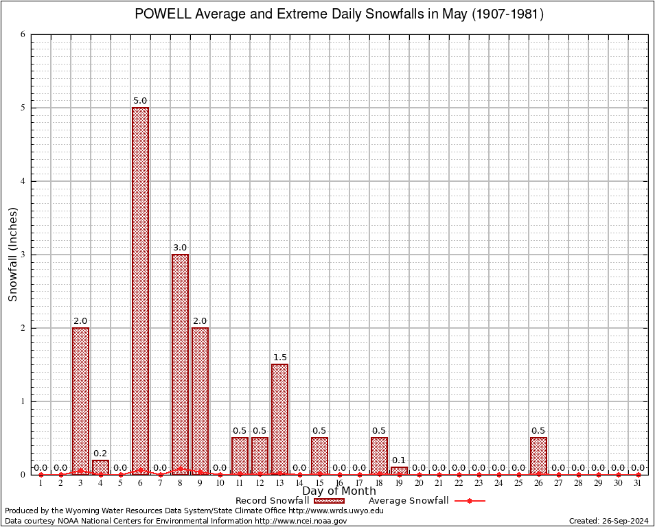 POWELL (487380) May Average and Extreme Daily Snowfall AMounts (1907-1981) To index page for POWELL
