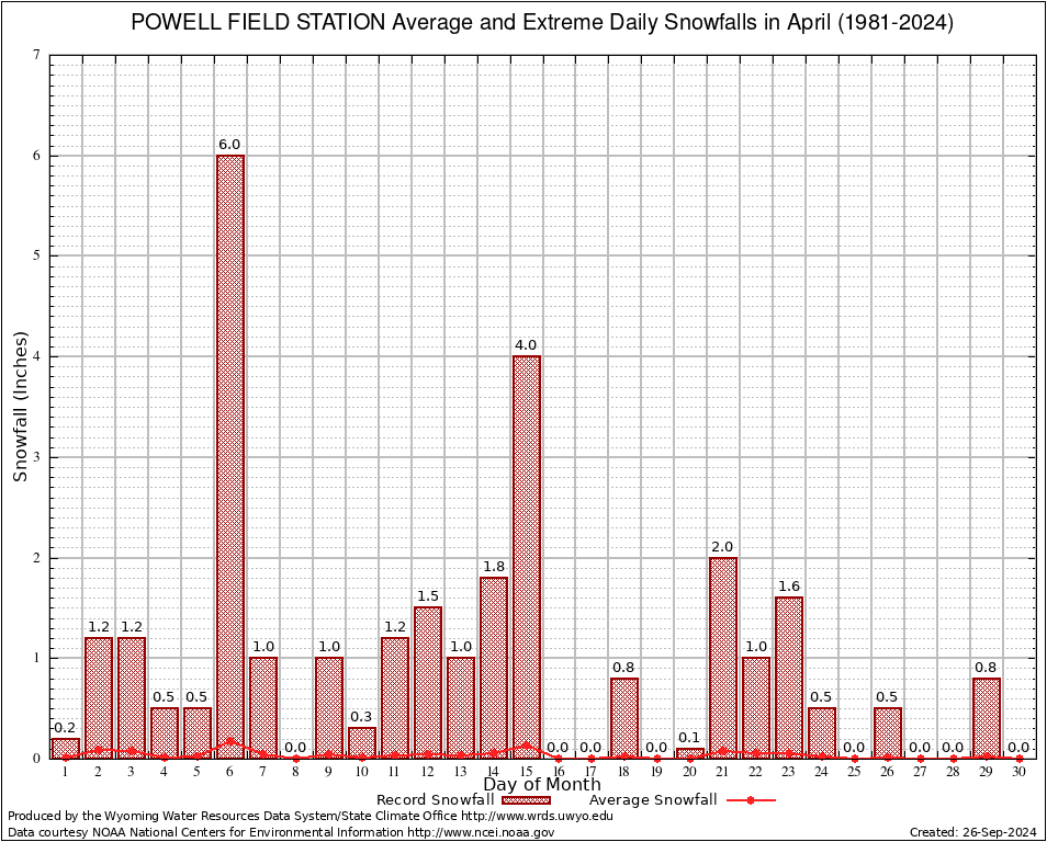 April Average and Extreme Daily Snowfall AMounts (1981-2024)