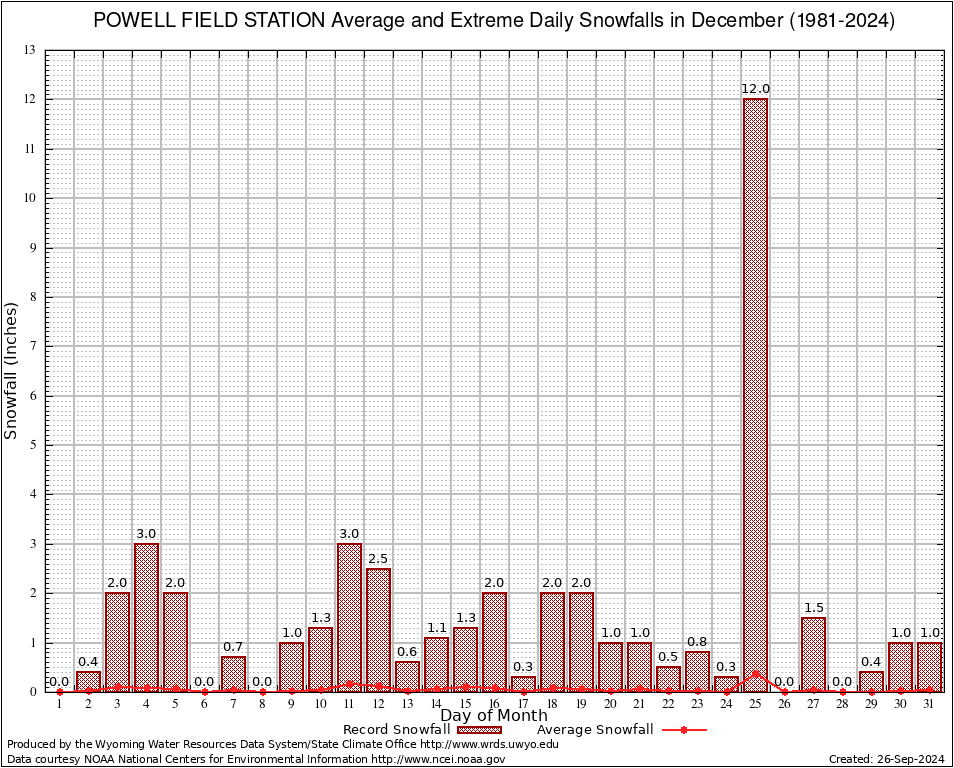 December Average and Extreme Daily Snowfall AMounts (1981-2024)