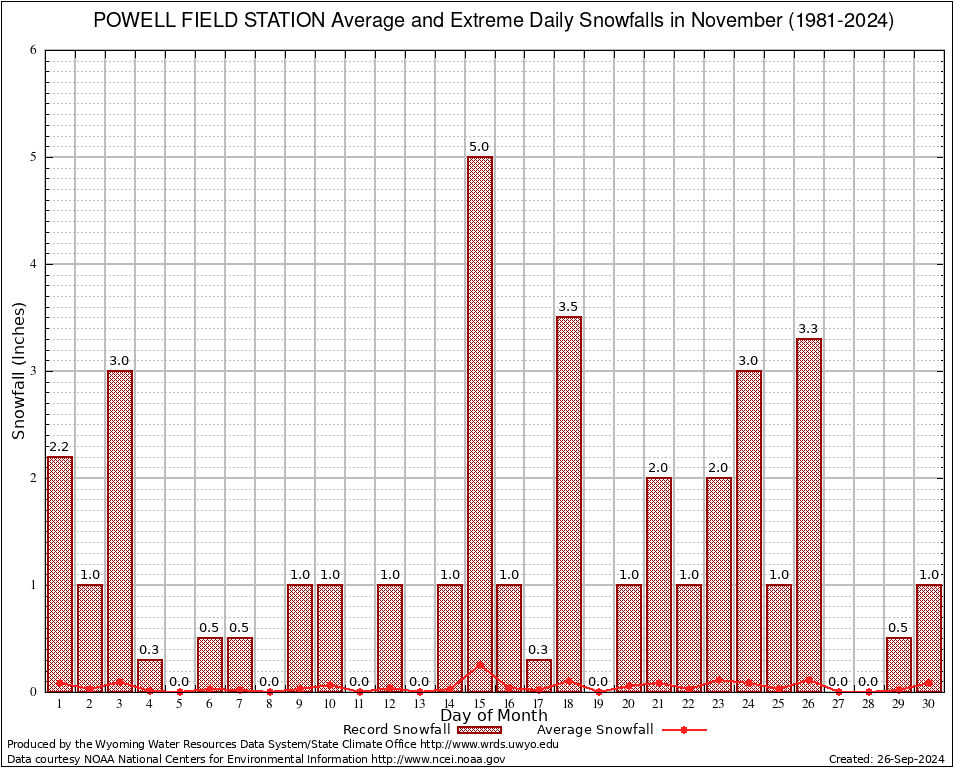 November Average and Extreme Daily Snowfall AMounts (1981-2024)