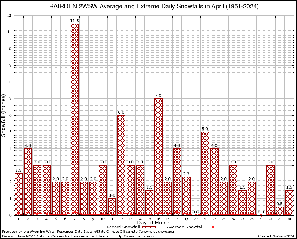 April Average and Extreme Daily Snowfall AMounts (1951-2024)