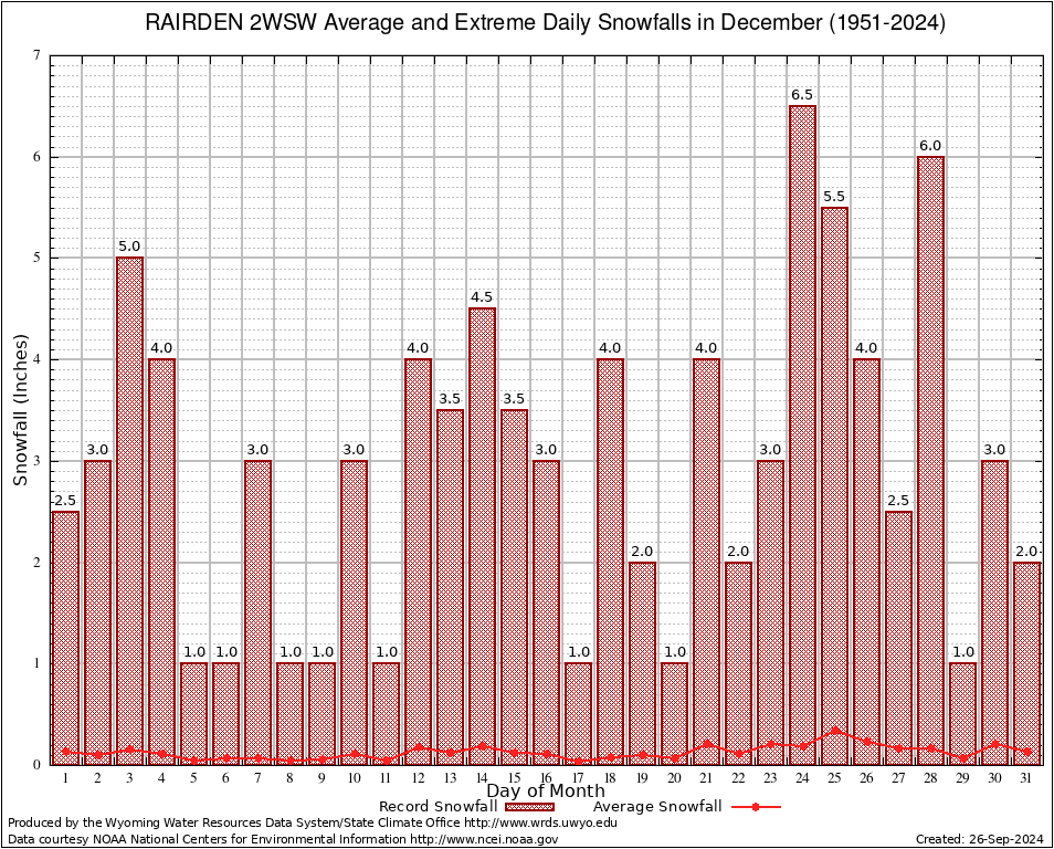 December Average and Extreme Daily Snowfall AMounts (1951-2024)