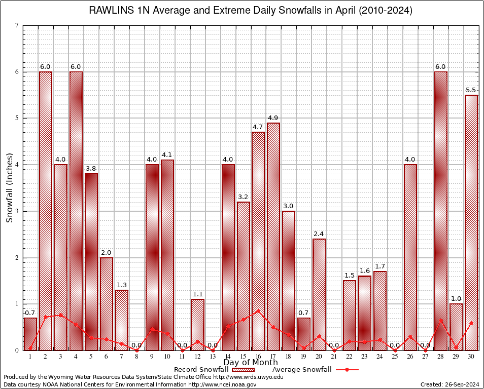 April Average and Extreme Daily Snowfall AMounts (2010-2024)