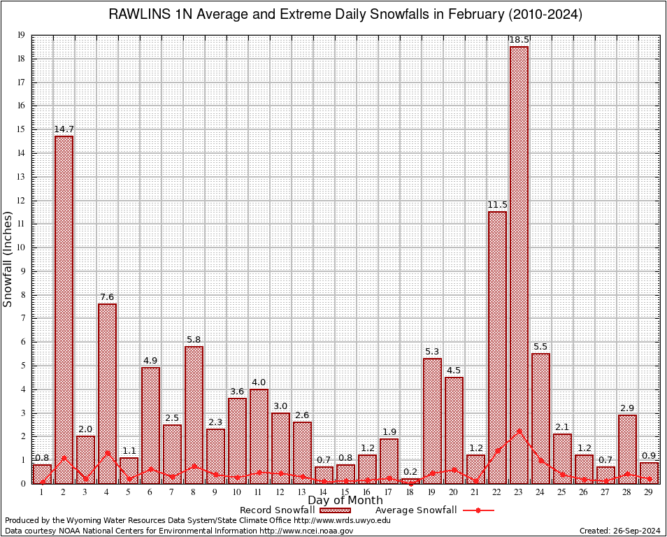 RAWLINS 1N (487529) February Average and Extreme Daily Snowfall AMounts (2010-2024) To index page for RAWLINS 1N