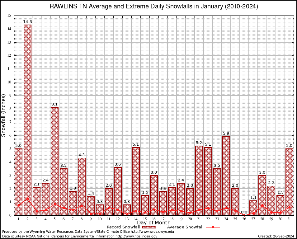 January Average and Extreme Daily Snowfall AMounts (2010-2024)