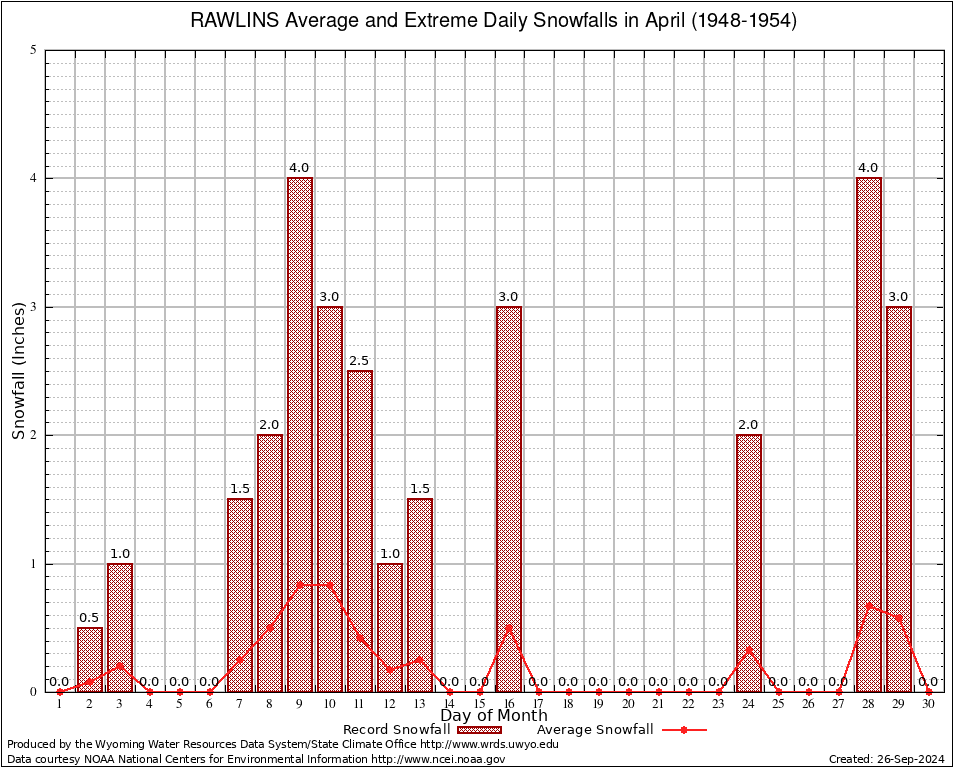 RAWLINS (487530) April Average and Extreme Daily Snowfall AMounts (1948-1954) To index page for RAWLINS