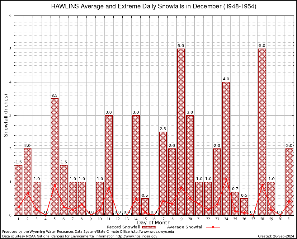 RAWLINS (487530) December Average and Extreme Daily Snowfall AMounts (1948-1954) To index page for RAWLINS