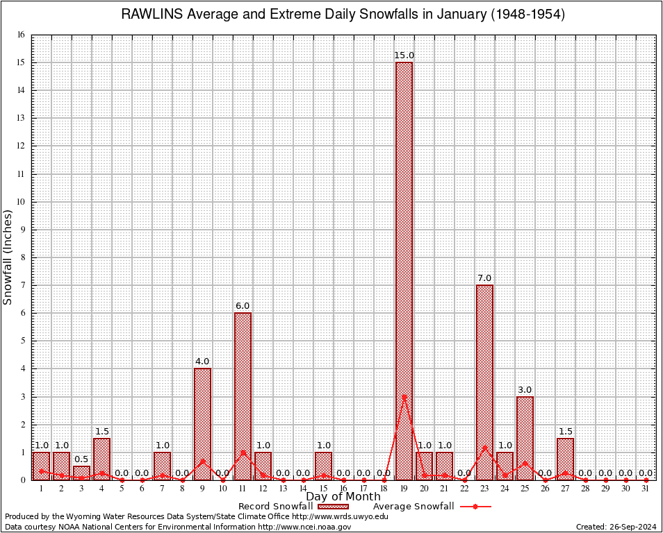 RAWLINS (487530) January Average and Extreme Daily Snowfall AMounts (1948-1954) To index page for RAWLINS