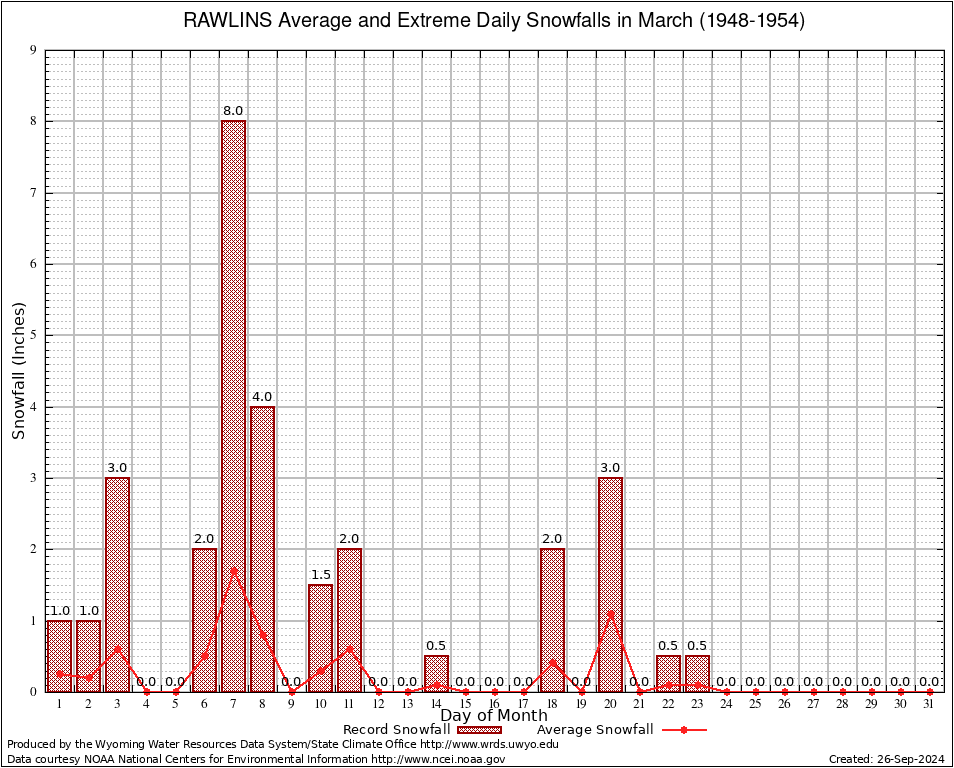 RAWLINS (487530) March Average and Extreme Daily Snowfall AMounts (1948-1954) To index page for RAWLINS
