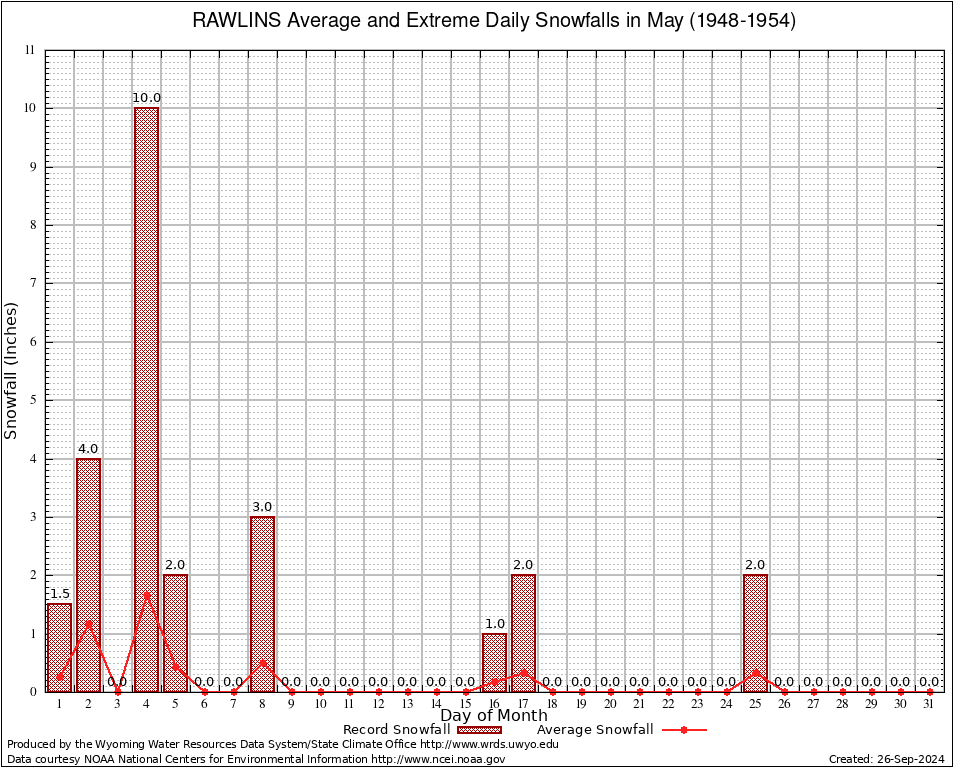 RAWLINS (487530) May Average and Extreme Daily Snowfall AMounts (1948-1954) To index page for RAWLINS