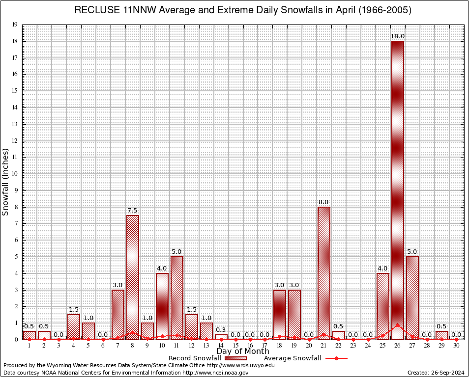 April Average and Extreme Daily Snowfall AMounts (1966-2005)