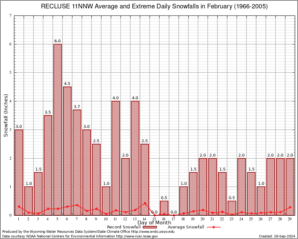 February Average and Extreme Daily Snowfall AMounts (1966-2005)
