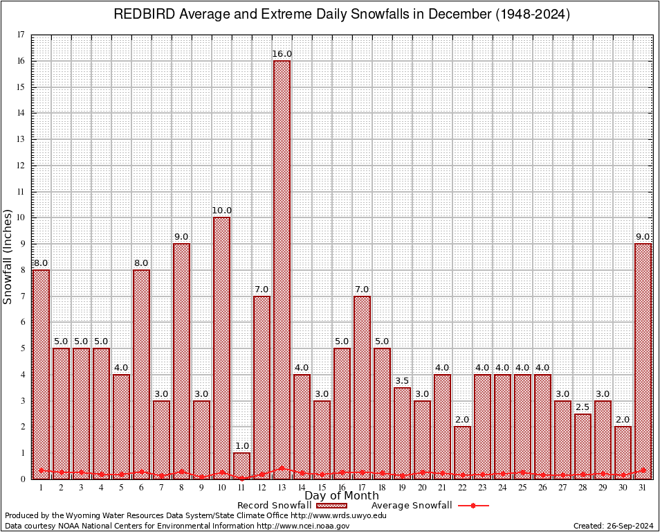 REDBIRD (487555) December Average and Extreme Daily Snowfall AMounts (1948-2024) To index page for REDBIRD