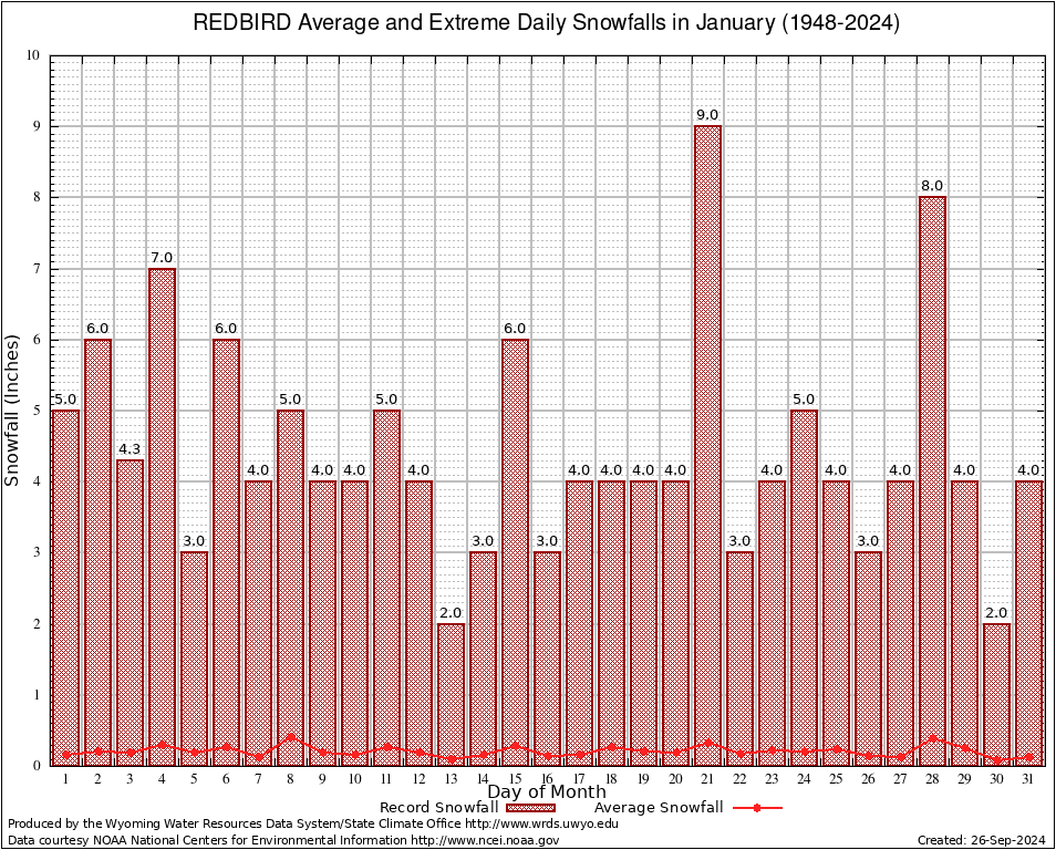 REDBIRD (487555) January Average and Extreme Daily Snowfall AMounts (1948-2024) To index page for REDBIRD