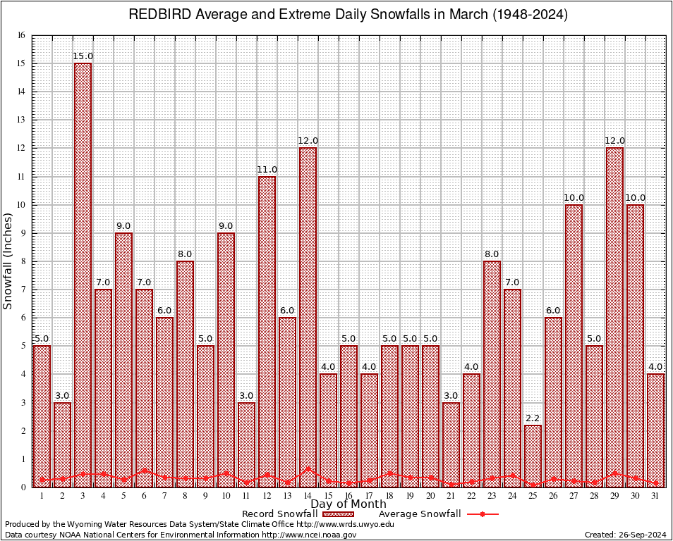 REDBIRD (487555) March Average and Extreme Daily Snowfall AMounts (1948-2024) To index page for REDBIRD