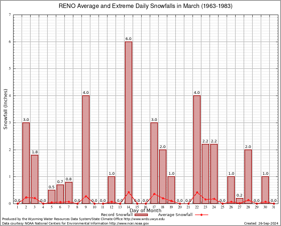 RENO (487683) March Average and Extreme Daily Snowfall AMounts (1963-1983) To index page for RENO