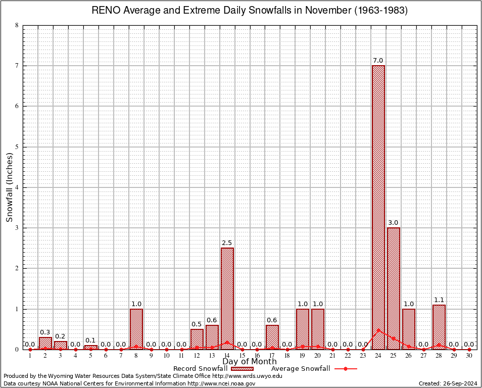 RENO (487683) November Average and Extreme Daily Snowfall AMounts (1963-1983) To index page for RENO