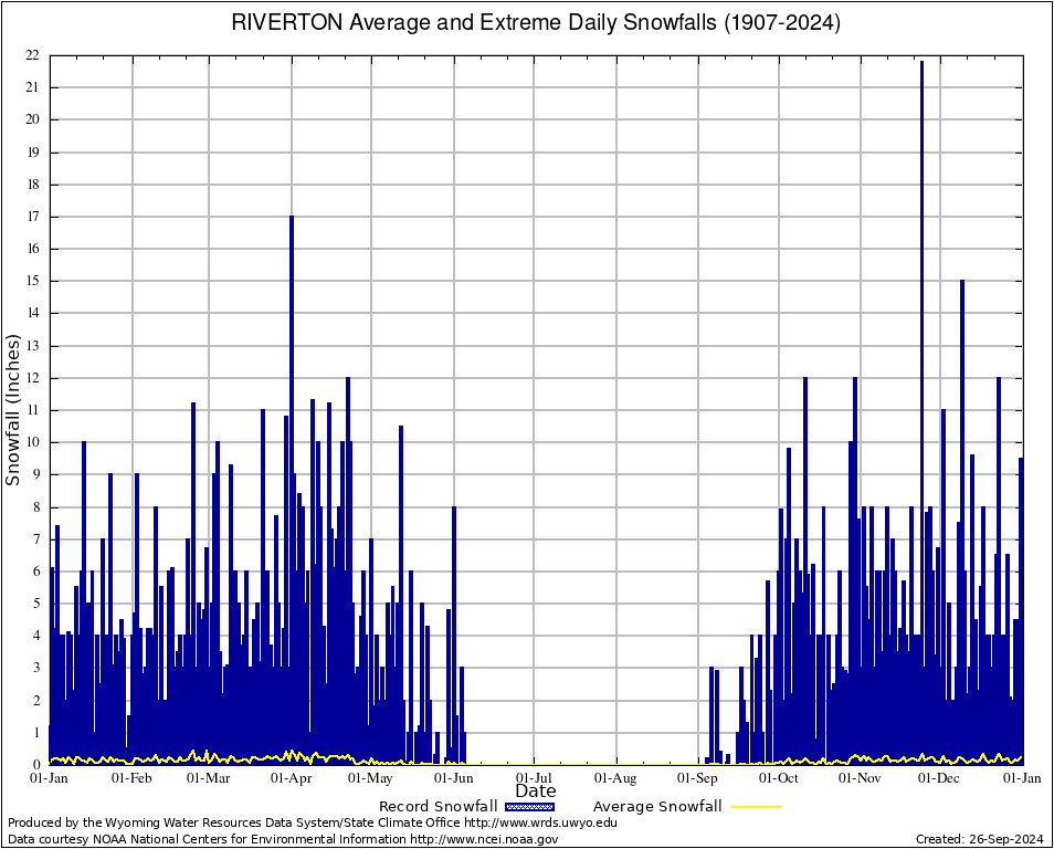 RIVERTON (487760) Annual Average and Extreme Daily Snowfall AMounts (1907-2024) To index page for RIVERTON