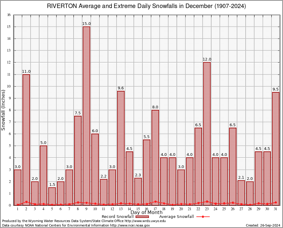 RIVERTON (487760) December Average and Extreme Daily Snowfall AMounts (1907-2024) To index page for RIVERTON