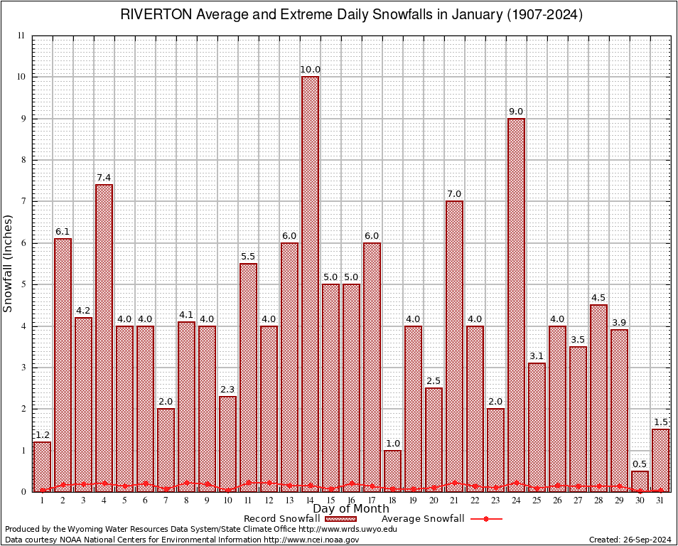 RIVERTON (487760) January Average and Extreme Daily Snowfall AMounts (1907-2024) To index page for RIVERTON