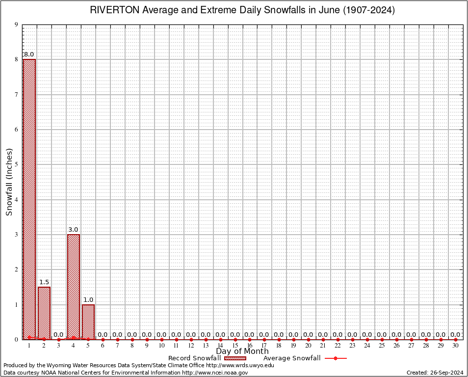RIVERTON (487760) June Average and Extreme Daily Snowfall AMounts (1907-2024) To index page for RIVERTON