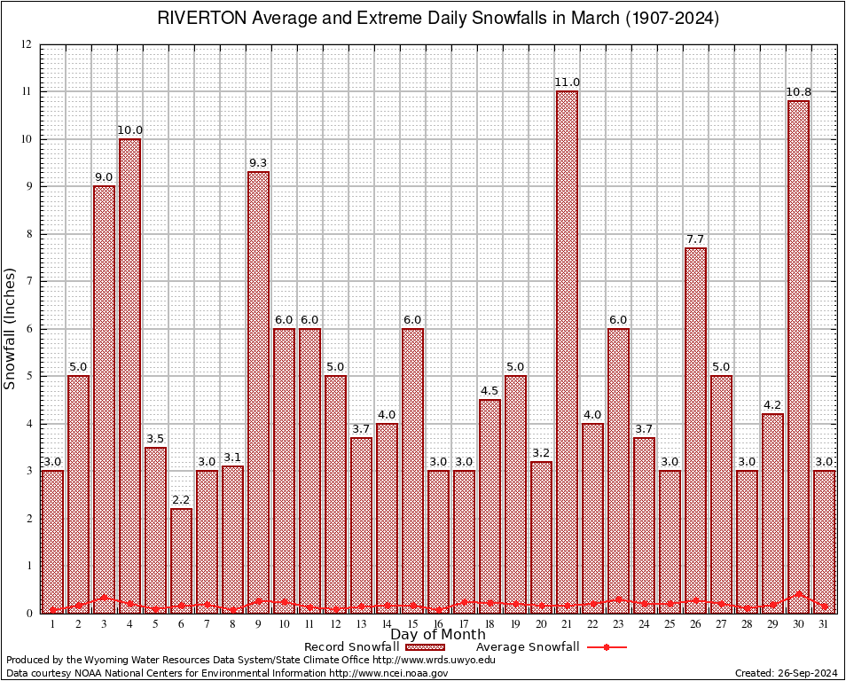 RIVERTON (487760) March Average and Extreme Daily Snowfall AMounts (1907-2024) To index page for RIVERTON