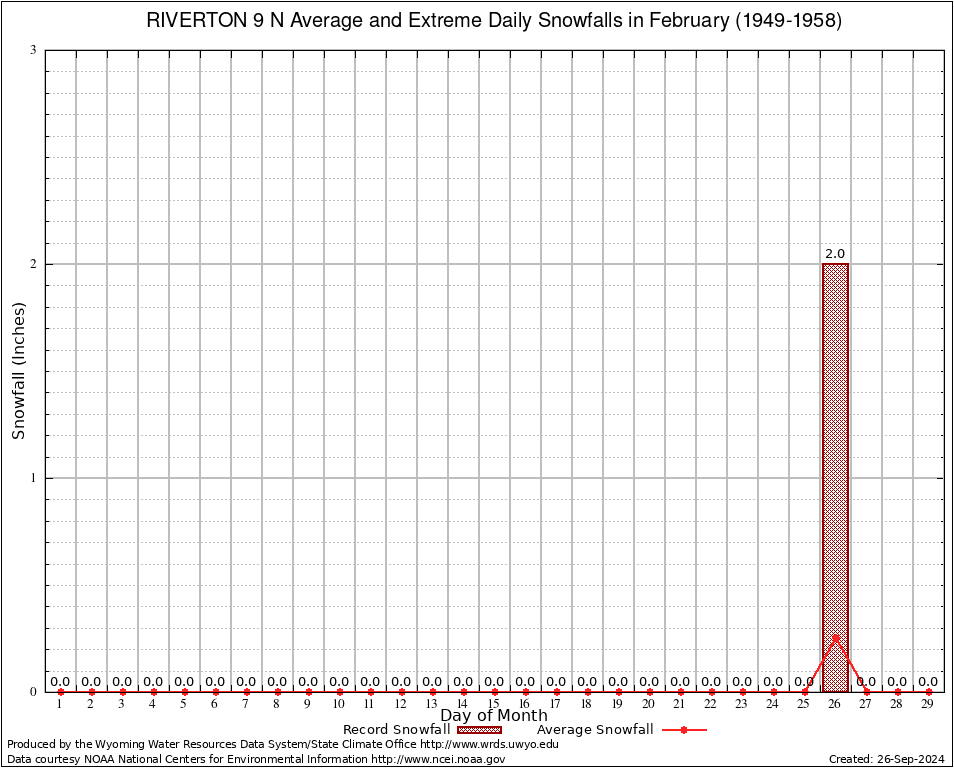 February Average and Extreme Daily Snowfall AMounts (1949-1958)