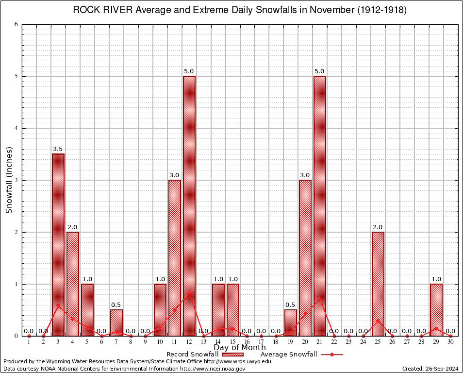 ROCK RIVER (487830) November Average and Extreme Daily Snowfall AMounts (1912-1918) To index page for ROCK RIVER