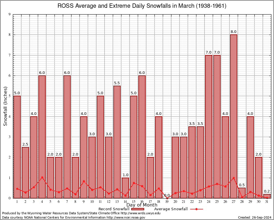 ROSS (487895) March Average and Extreme Daily Snowfall AMounts (1938-1961) To index page for ROSS