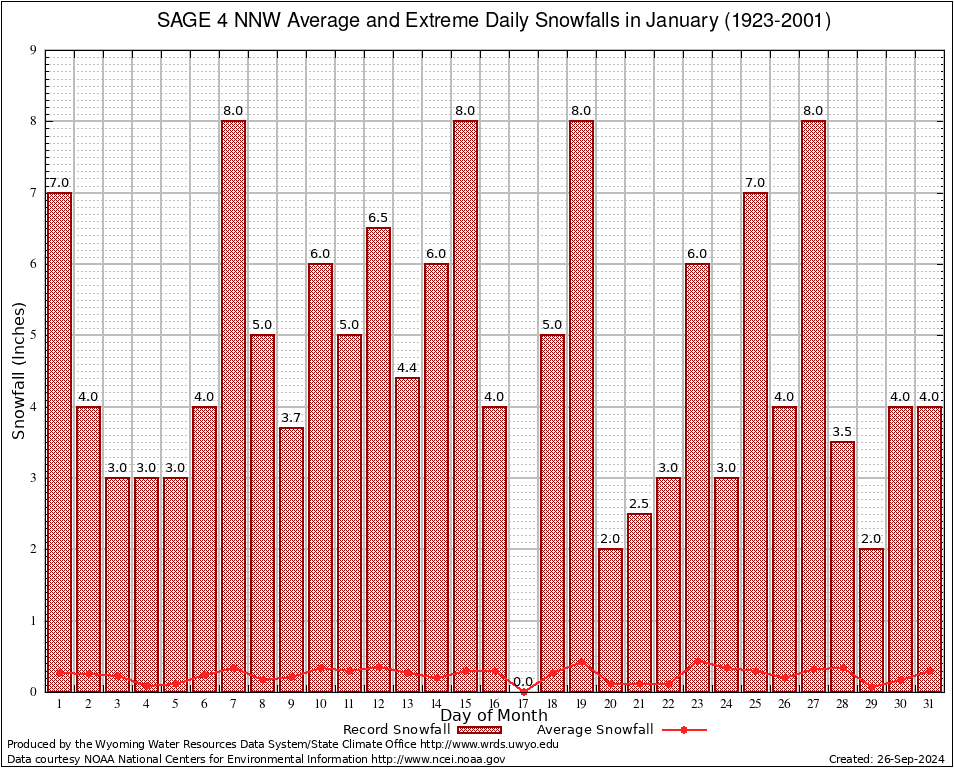 January Average and Extreme Daily Snowfall AMounts (1923-2001)